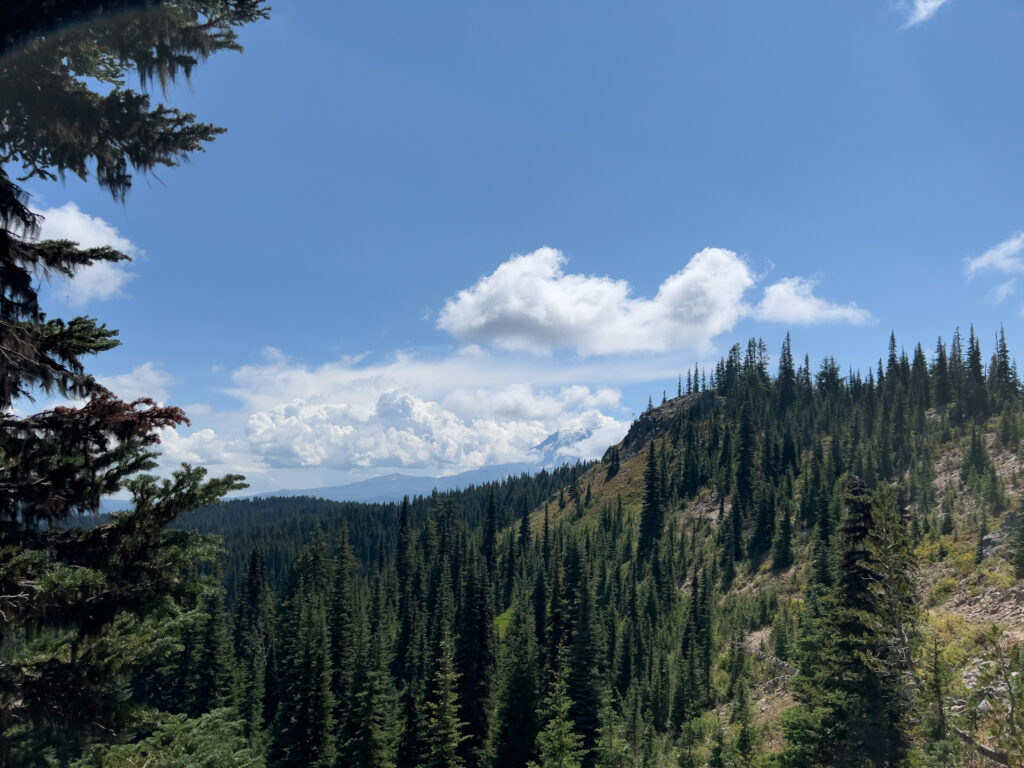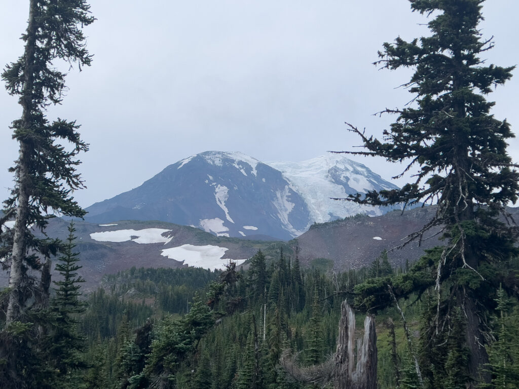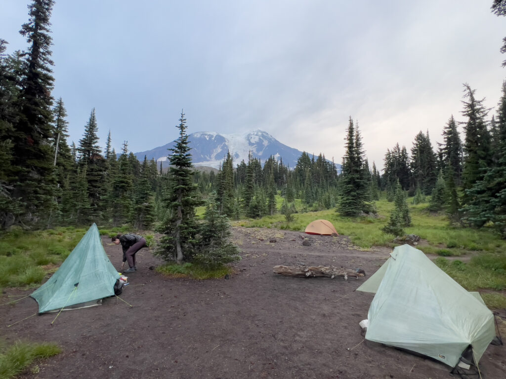 Eine Stunde später, also bereits um 06:00 Uhr hörte es bereits wieder auf zu regnen. Und wir konnten endlich Mount Adams von unserem Zeltplatz aus sehen