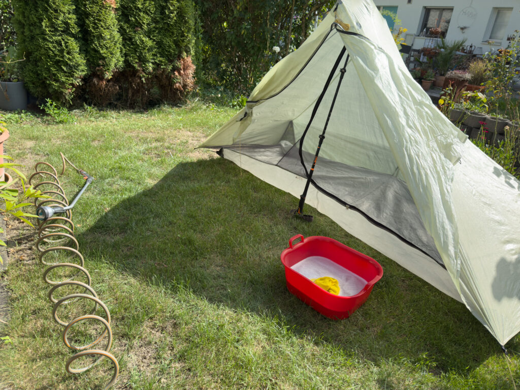 Für mich heisst dies, meine Ausrüstung muss sauber sein. Schuhe und Wanderstöcke sind neu, also sauber. Einige Outdoor Ausrüstungen habe ich aber schon mehrmals gebraucht, diese muss ich säubern. Hier als Beispiel die Reinigung meines Zeltes: