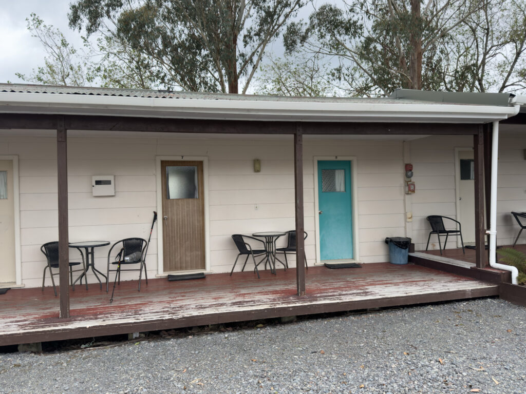 Um 11:00 Uhr erschien dann ein Mann aus einem Tor im Bretterzaun und fragte freundlich was wir hier wollten. Ich sagte, wir warten um einchecken zu können. Dann sagte er, wir sollen hereinkommen und es uns gemütlich machen. Die Küche sei bereits geöffnet, nur die WCs und Duschen müssten noch fertig gereinigt werden, das sei dann in ca 30 Minuten so weit. Dann wollte er noch wissen ob wir TA Hiker sind und ob wir Zelten (25.—) oder eine Cabine (60.— einzeln, 80.— Doppelbelegung) wollten. Ich entschied mich für eine Cabine, da es sehr nach Regen aussah.