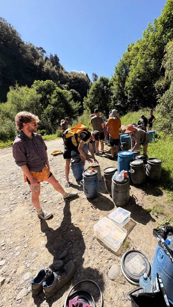 Jeder Hiker hatte zwei kleine wasserdichte Fässer und ein grosses nicht wasserdichtes Fass oder Tasche für nicht Wasser empfindliche Ausrüstung zur Verfügung. Das eine kleine Fass ist für das Essen, das zweite für Schlafsack, Kleidung, Isomatte, Elektronik etc. In das grosse Fass kommt der Rucksack, Wanderstöcke, Schaumstoffmatte, Campschuhe…