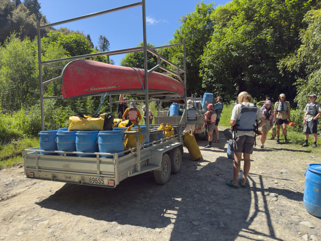 Die gepackten Fässer wurden uns dann per Anhänger zum Fluss runter gefahren und die Beladung der Kanus nach einem vorgegebene Schema begann